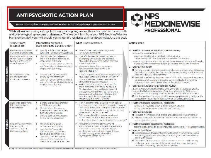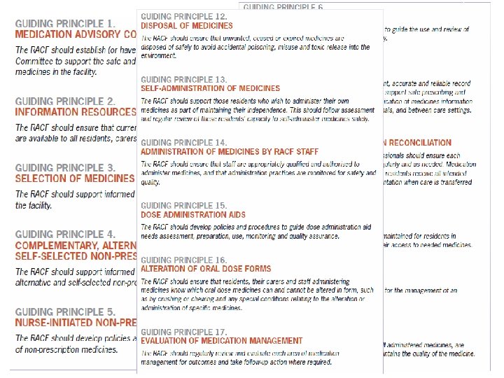 Changing approaches to medications in RACFs • Staff turnover rapid • Access to GPs often difficult (and specialists, impossible!) • Increasing roles – Pharmacists – Nurse practitioners – Government and professional bodies