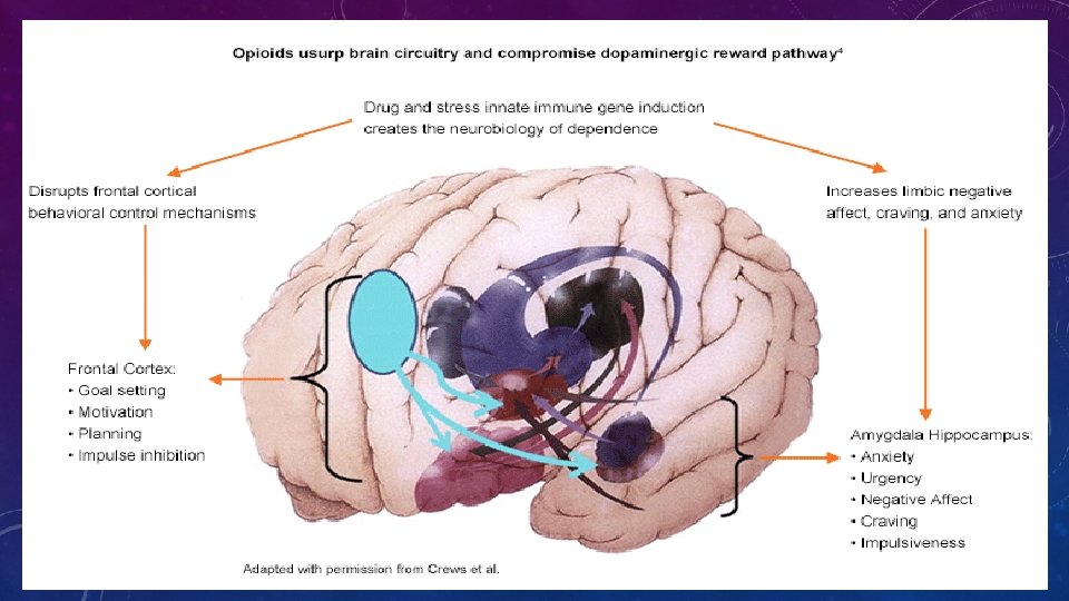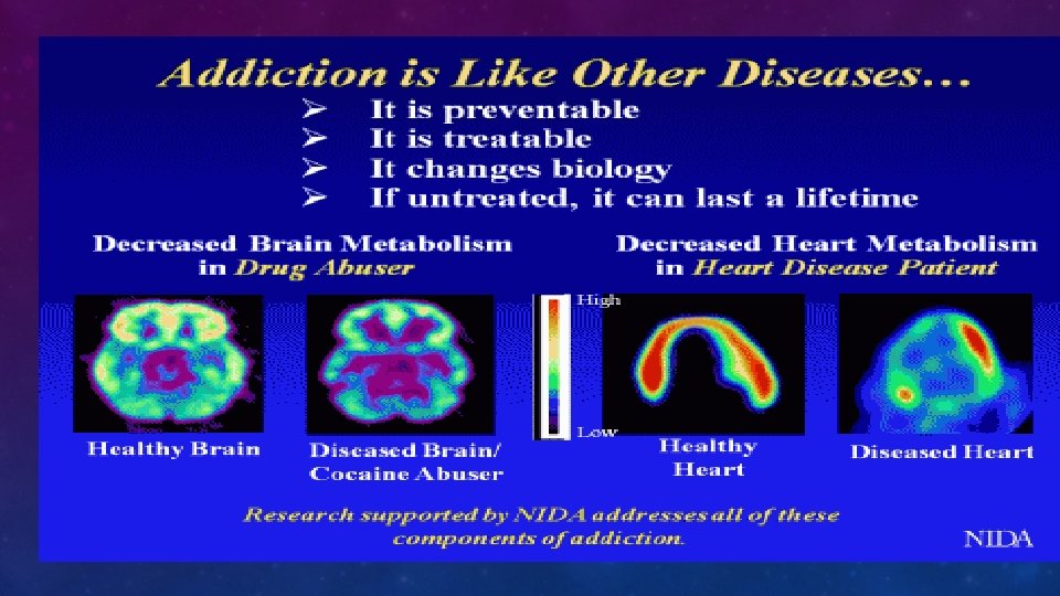 DEFINITION OF ADDICTION (NIDA) • Chronic, relapsing disorder characterized by • compulsive drug seeking and use • despite adverse consequences. • It is considered a brain disorder because • it involves functional changes to brain circuits involved in reward, stress, and self-control • those changes may last a long time after a person has stopped taking drugs.