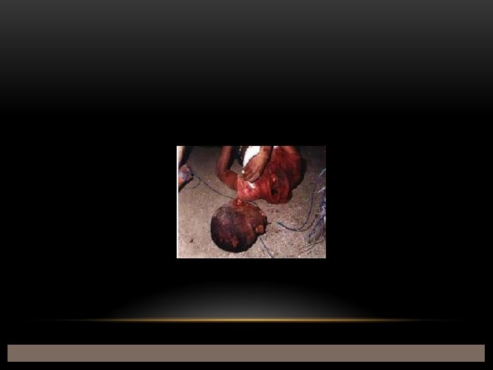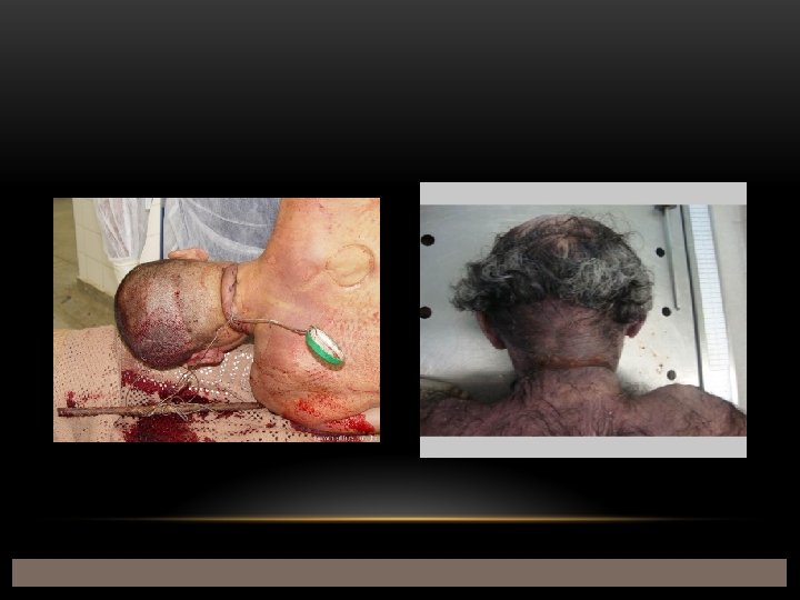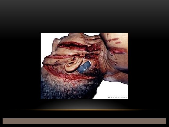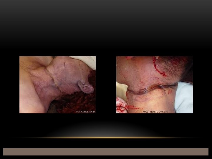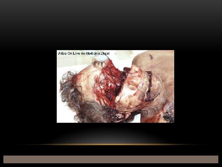ESGORJAMENTO, DEGOLA E DECAPITAÇÃO • São lesões de natureza geralmente incisas localizadas no pescoço (Delton Croce). • O esgorjamento é a lesão localizada na região anterior do pescoço. • A degola na região posterior. • A decapitação é a separação da cabeça do corpo.