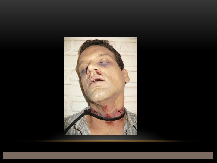 ESTRANGULAMENTO • O estrangulamento pode ser definido como a constrição do pescoço por baraço mecânico (corda ou cordel) acionado por força estranha ao peso do próprio corpo. • Características do sulco: • transversal e horizontal, eventualmente ser oblíquo; e podendo • contínuo e homogêneo em relação à profundidade, já que não existe o nó típico do enforcamento.
