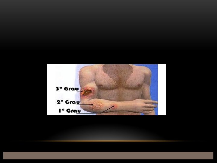 QUEIMADURAS Quanto à profundidade, segundo queimaduras classificam-se em: q Hoffmann, as 1º Grau - queimaduras leves, simples formação de eritemas; q 2º Grau - formação de flictenas áreas eritematosas; q 3º Grau - atingem a derme e os tecidos adjacentes dando origem à formação de escaras; e q 4º Grau - carbonização.