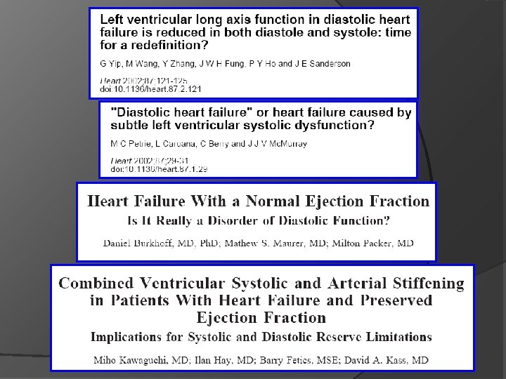 “Diastolic Heart Failure: Miles to Go Before We Sleep” “Patients with diastolic heart failure likely represent the largest group of patients with a cardiovascular disorder of substantial public health impact who have not been sistematically studied” Lynne W. Stevenson Am J Med, 2000