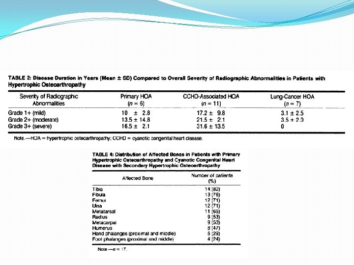 Periostitis in HOA �In our seven patients with lung-cancer HOA, less prominent periosteal changes were noted in a more limited distribution. �Malignancy-associated HOA, a disease process of much shorter duration, the natural evolution of the osseous changes cannot fully be expressed.