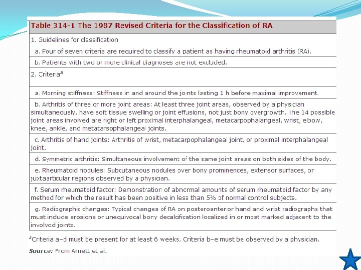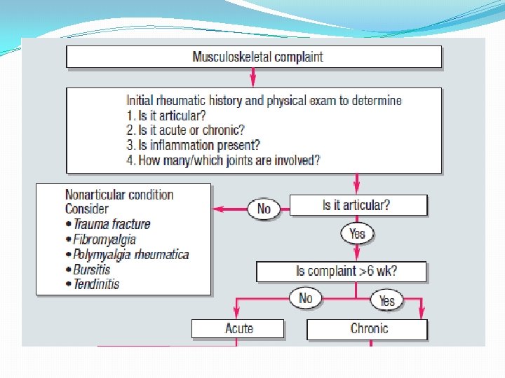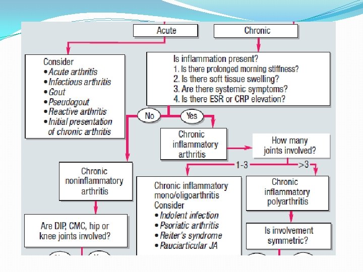 Patient Joints Systemic symptoms Timing Labs Radio findings Rheumatoid Arthritis Tibial area, PIP, MCP/MTP, digits, wrist, elbow, wrist knee, ankle fever Weakness, easy fatigability, anorexia, weight loss, ±fever, nodules ± Movement, morning , >1 hr acute phase reactants (+) RF, elevated acute phase reactants Normal Hand Xray erosions or unequivocal bony decalcification Osteoarthritis Knees, hips None Acute Rheumatic Fever HOA Migratory Tibia, wrists, polyarthritis digits, elbow Fever, sore throat ± No specific timing Normal/