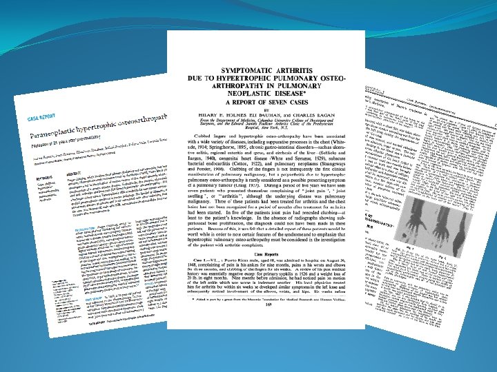 Hypertrophic Pulmonary Osteoarthropathy �It is a general conception that the malignant neoplasms associated with HPO are primary in the lung and that metastatic tumors to the lungs are rarely associated with HPO. Hammarsten JF, O'Leary J: The features and significance of hypertrophic osteoarthropathy, Arch Intern Med 99: 431 -441, 1956