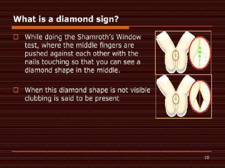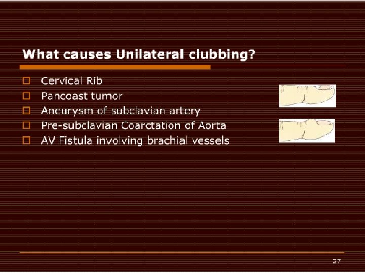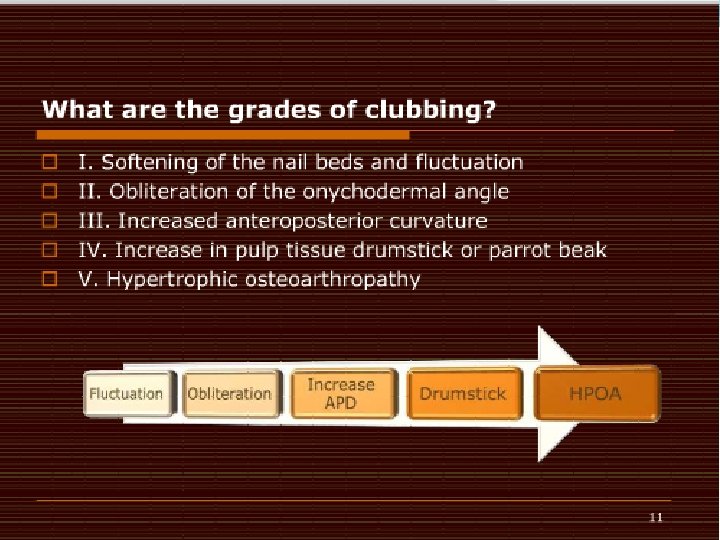 � Clubbing usually progresses through 4 phases. 8 � Fluctuation and softening of the nail bed, with a rocking sensation upon palpation due to increased edema and soft tissue � Loss of the normal 15° angle (Lovibond angle 27 ) between the nail and cuticle � Accentuation of the convexity of the nails and clubbed appearance of the fingertips, with warmth and sweating � Shiny or glossy change in the nail and adjacent skin, with disappearance of the normal creases and appearance of longitudinal striation of the nail � Clubbing can be classified into 3 topographical groups. 28, 29 � Symmetrical: All the fingers and toes are involved, as depicted in the image below. � � � Clubbing associated with hypertrophic osteoarthropathy can be classified into 3 topographical groups (ie, symmetrical, unilateral, unidigital). This is symmetrical clubbing; it involves all the fingers and toes. [ CLOSE WINDOW ] Clubbing associated with hypertrophic osteoarthropathy can be classified into 3 topographical groups (ie, symmetrical, unilateral, unidigital). This is symmetrical clubbing; it involves all the fingers and toes. Unilateral: The fingers or toes of 1 hand or foot are involved. Unidigital: Only 1 finger or toe is involved.