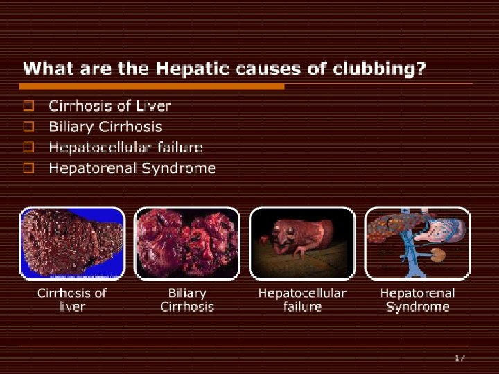 Other secondary causes �Pulmonary Tuberculosis �Congenital Cyanotic Heart Disease �Hepatic and Colorectal Carcinoma �Inflammatory Bowel Disease �Cirrhosis �Pulmonary Fibrosis and Empyema Armstrong David, Mc. Causland Elisabeth, Wright Gary: Hypertrophic pulmonary osteoarthropathy (HPOA) (Pierre Marie-Bamberger syndrome): two cases presenting as acuteinflammatory arthritis. Description and review of the literature. Rheumatol Int 2007, 27