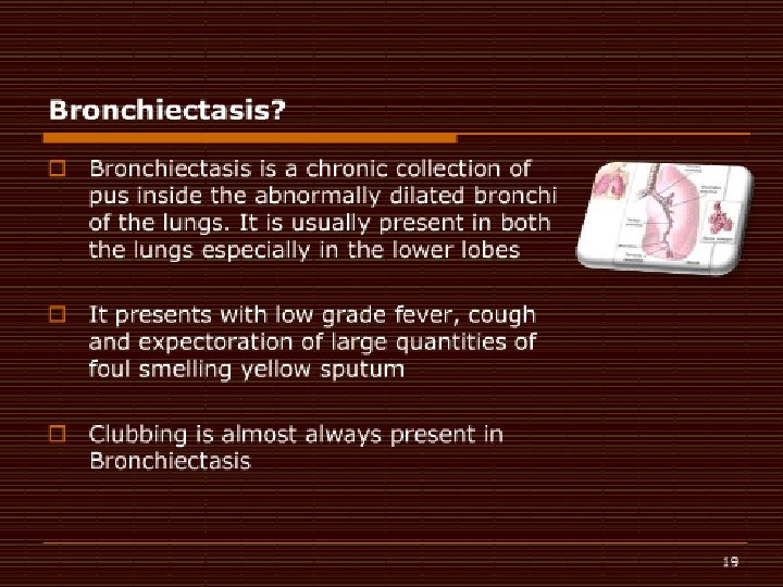 Hypertrophic pulmonary osteoarthropathy (HPOA) �The pulmonary lesions were generally larger than 5 cm �However, in some cases, the major mass lesion was located in the lower lobes of the lung & was in direct contact with the pleural surfaces, either anteriorly or diaphragmatically