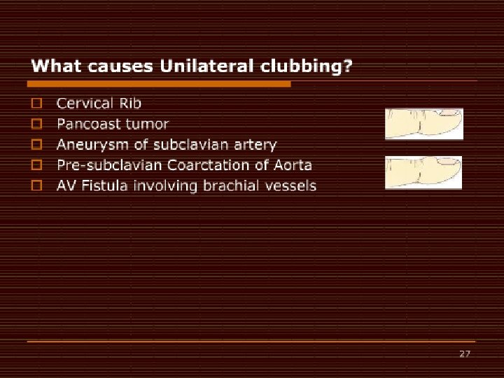 Diagnostic Criteria �Clubbing, Joint Pains, Periostosis of the tubular bones �Three other forms of hypertrophic osteoarthropathy are described: (1) clubbing alone (2) periostosis without clubbing in the setting of an illness known to be associated with hypertrophic osteoarthropathy, and (3) pachydermia associated with minor manifestations Martinez-Lavin M, Matucci-Cerinic M, Jajic I, Pineda C. Hypertrophic osteoarthropathy: consensus on its definition, classification, assessment and diagnostic criteria. J Rheumatol. Aug 1993; 20(8): 1386 -7
