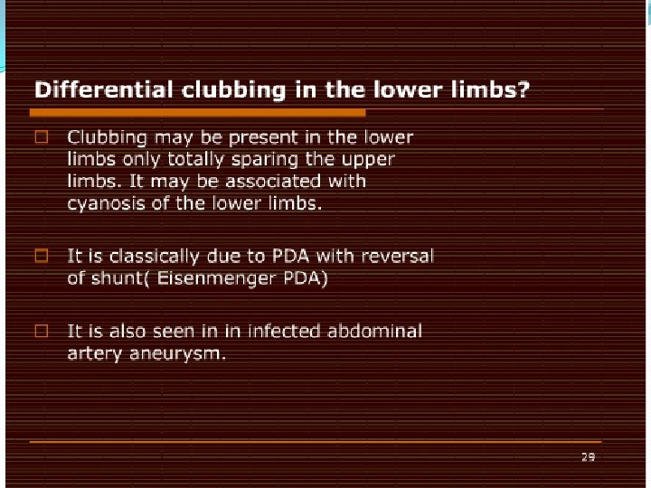 PHYSICAL EXAMINATION �Extremities: (+) digital clubbing on all extremities (+)bilateral tibial tenderness, non erythematous, not warm to touch (+) limitation of movement on wrist & ankle flexion & finger flexion and opposition (-) cyanosis, crepitus Shamroth’s test