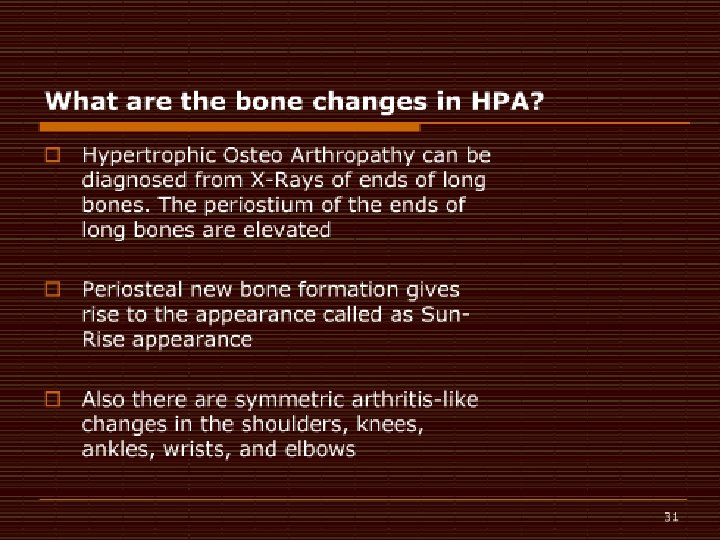 Hypertrophic Osteoarthropathy on Xray �The periostium of the ends of long bones are elevated �Periosteal new bone formation gives rise to the appearance called as “Sun-Rise” appearance
