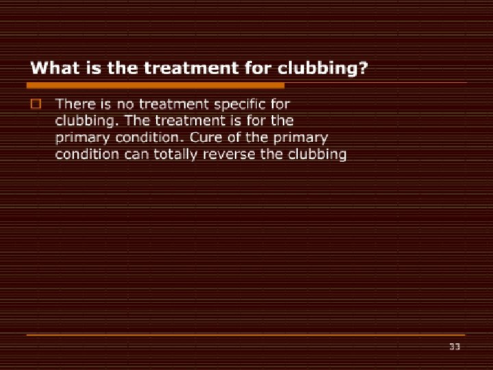 Clinical Presentation �Mild to severe arthralgias on metacarpal joints, wrists, elbows, knees, ankles. �Range of motion of affected joints may be slightly decreased �When effusions are present, they usually involve the large joints (eg, knees, ankles, wrists). Martinez-Lavin M, Matucci-Cerinic M, Jajic I, Pineda C. Hypertrophic osteoarthropathy: consensus on its definition, classification, assessment and diagnostic criteria. J Rheumatol. Aug 1993; 20(8): 1386 -7