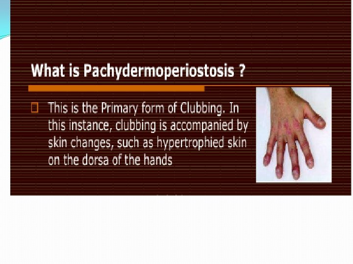 Pathophysiology �Exact mechanism of the syndrome is still unclear. Marinez-Levin M, Pineda C: Hypertrophic osteoarthropathy. Rheumatology 3 rd edition. Edited by: Hochberg MC, Silman AJ, Smolen JS, Weinblatt ME, Weisman MH. Mosby, Edinburgh; 2003: 1763 -1767