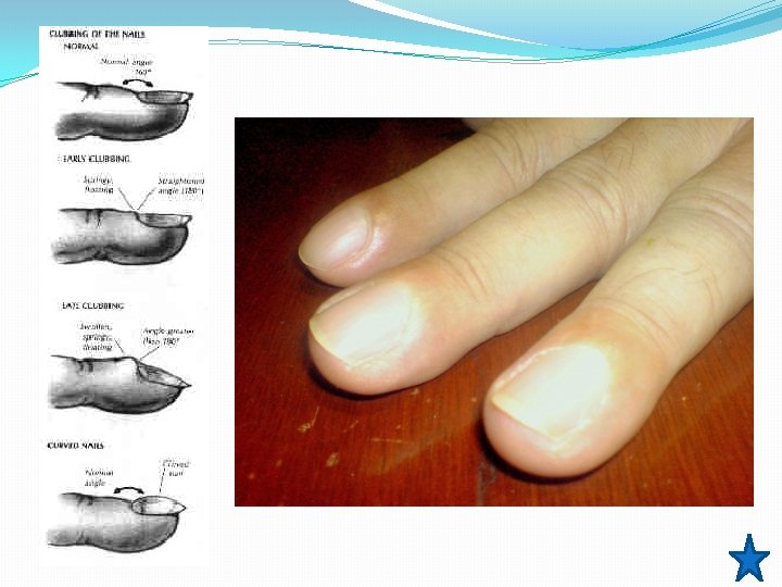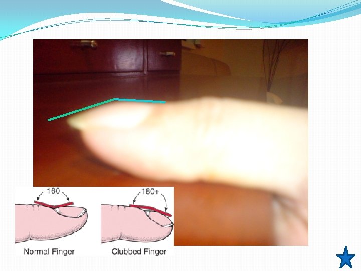 Lovibond angle Normal Angle = less than or equal to 160°. Flat/ >180 = clubbing Swartz MH. Textbook of Physical Diagnosis: History and Examination. 2 nd ed. Philadelphia, Pa: WB Saunders; 1994: 76 -8.
