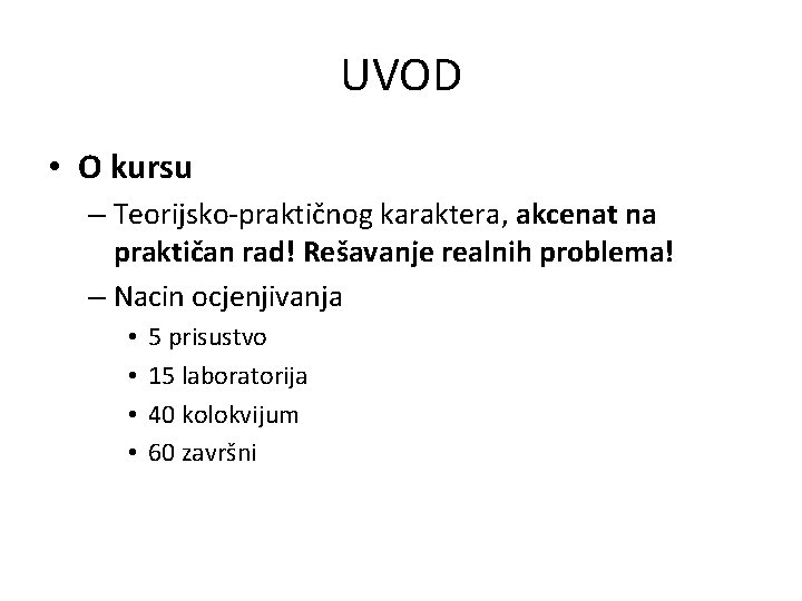 UVOD • O kursu – Teorijsko-praktičnog karaktera, akcenat na praktičan rad! Rešavanje realnih problema! – Nacin ocjenjivanja • • 5 prisustvo 15 laboratorija 40 kolokvijum 60 završni