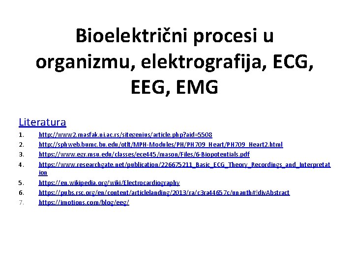 Bioelektrični procesi u organizmu, elektrografija, ECG, EEG, EMG Literatura 1. 2. 3. 4. 5. 6. 7. http: //www 2. masfak. ni. ac. rs/sitegenius/article. php? aid=5508 http: //sphweb. bumc. bu. edu/otlt/MPH-Modules/PH/PH 709_Heart 2. html https: //www. egr. msu. edu/classes/ece 445/mason/Files/6 -Biopotentials. pdf https: //www. researchgate. net/publication/226675211_Basic_ECG_Theory_Recordings_and_Interpretat ion https: //en. wikipedia. org/wiki/Electrocardiography https: //pubs. rsc. org/en/content/articlelanding/2013/ra/c 3 ra 44657 c/unauth#!div. Abstract https: //imotions. com/blog/eeg/
