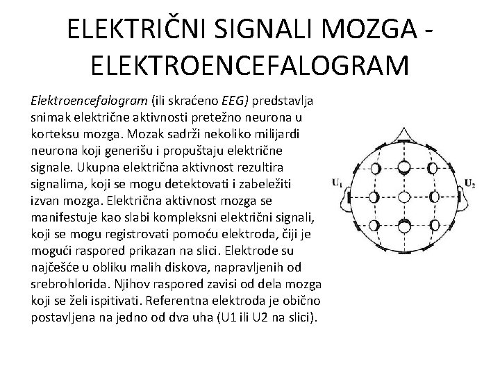 ELEKTRIČNI SIGNALI MOZGA ELEKTROENCEFALOGRAM Elektroencefalogram (ili skraćeno EEG) predstavlja snimak električne aktivnosti pretežno neurona u korteksu mozga. Mozak sadrži nekoliko milijardi neurona koji generišu i propuštaju električne signale. Ukupna električna aktivnost rezultira signalima, koji se mogu detektovati i zabeležiti izvan mozga. Električna aktivnost mozga se manifestuje kao slabi kompleksni električni signali, koji se mogu registrovati pomoću elektroda, čiji je mogući raspored prikazan na slici. Elektrode su najčešće u obliku malih diskova, napravljenih od srebrohlorida. Njihov raspored zavisi od dela mozga koji se želi ispitivati. Referentna elektroda je obično postavljena na jedno od dva uha (U 1 ili U 2 na slici).
