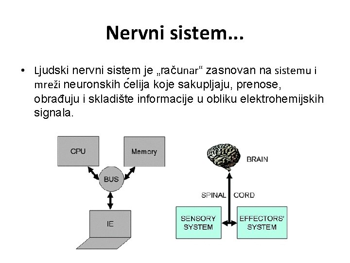 Nervni sistem. . . • Ljudski nervni sistem je „računar“ zasnovan na sistemu i mreži neuronskih c elija koje sakupljaju, prenose, obrađuju i skladište informacije u obliku elektrohemijskih signala.