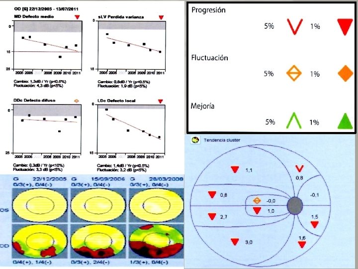 2547 campos visuales de 317 ojos de 171 pacientes mediana 8, 5 años (2, 5 -11, 6): - 42 Sanos X MD 3 - 64 incipientes (X MD 2 -6) - 153 HTO (X MD ≤ 2) - 44 moderados (X MD 6 -12) últimos CV con al menos - 122 Glaucomatosos. - 14 avanzados (X MD >12) ≤ 2/4 FP/FN Variables incluidas: - Eye. Suite: A. Global: cambio y fluctuación en el defecto medio (MD), defecto difuso, defecto focal y la varianza de pérdida, significación del cambio, tiempo de evolución, número de campos visuales. Clusters: MD, significación del cambio. - Historia clínica: edad, sexo, cirugía de glaucoma, cirugía de catarata, tratamiento láser( SLT, capsulotomía e iridotomía), número de fármacos hipotensores y cambios en el tratamiento. SPSS para Windows (versión 15. 0)