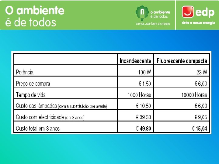 Vamos ver o que se pode ganhar! Procedemos a uma comparação entre uma lâmpada incandescente e uma fluorescente compacta capazes de fornecer iguais condições de iluminação. As condições para a comparação foram o funcionamento durante quatro horas por dia, num período de três anos. Os resultados da comparação podem ser consultados na tabela seguinte.