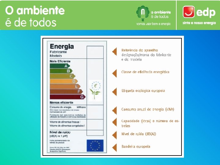 Além de indicar dados de consumo, como a electricidade, a água ou o ruído, a etiqueta classifica os equipamentos conforme o seu nível de eficiência, desde a letra A (o mais eficiente) até ao G (o menos eficiente). Muito embora esta classificação se aplique à maioria dos aparelhos, existem equipamentos para os quais apenas é permitida a comercialização das classes A a C (caso de alguns frigoríficos) e existe ainda uma classificação especial para frigoríficos de eficiência superior (Classe A+).
