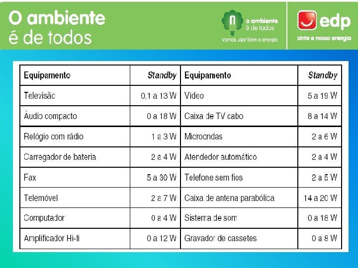 Veja o que pode ganhar! Mais importante do que o valor monetário poupado com a utilização racional da energia, que pode atingir níveis consideráveis, é a consciencialização para a necessidade de introduzir práticas que tenham em atenção o consumo desnecessário. Repare nos consumos resultantes do modo Standby ou OFF para vários equipamentos domésticos: