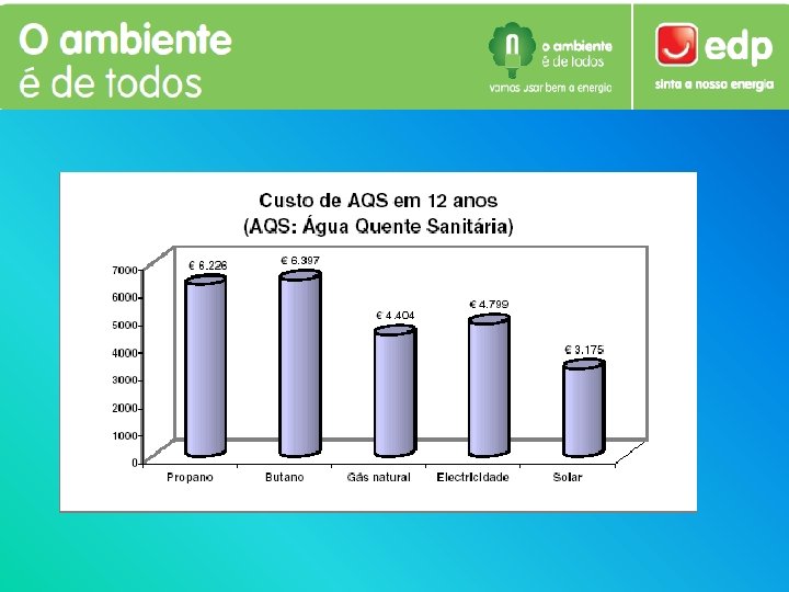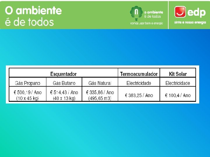 Veja o que pode ganhar! Os exemplos que se seguem são referentes a uma família de cinco pessoas, que tomem diariamente um duche. O consumo diário de água é de 350 litros, o que corresponde a um consumo de energia da ordem de 10 k. Wh. Foram calculados os custos anuais das várias alternativas tecnológicas, tendo-se chegado aos resultados expressos na tabela seguinte: