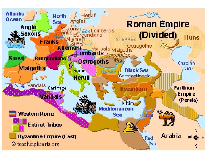 Multiple Causes of the Fall of Rome Contributing Factors POLITICAL Office seen as a burden SOCIAL Economic Military Decline in interests Poor harvests Threats in North Low confidence Disruption in trade Low funds for defense Lack of Patriotism Inflation Military interfered Civil war Rich/Poor contrast Tax burden Decline in population Gap between rich and poor Division of Empire Immediate Causes = Germanic Tribes and Huns Decline in population