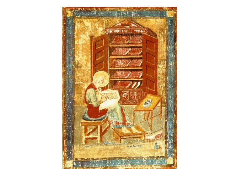 ILLUMINIATED MANUSCRIPTS Monasteries were places where monks and nuns copied manuscripts. The papyrus scroll used from Egypt to Rome was replaced by the vellum (calfskin) or parchment (lambskin) codes, made of separate pages bound at one side. Manuscripts were considered sacred objects containing the work of god. They were decorated lavishly, so their outward beauty would reflect their sublime contents. Covers were made of gold studded with precious and semiprecious gems. • Until printing was developed in the 15 th century, these manuscripts were the only form of books in existence, preserving not only religious teachings but also Classical literature.