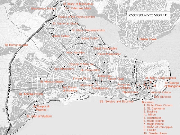 CONSTANTINOPLE • A GREEK COLONY FOUNDED BY SOME MEGARIANS in 663 B. C. under the name of BYZANTIUM • The Roman Emperor SEPTIMIUS SEVERUS rebuilt the city in the mid-3 nd century A. D. • Foundation of CONSTANTINOPLE by the Emperor CONSTANTINE I in 324 -330 A. D. • Constantinople= Polis of Constantine I (312337 A. D. )