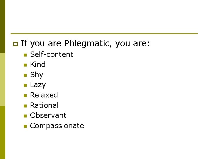 p If you are Phlegmatic, you are: n n n n Self-content Kind Shy Lazy Relaxed Rational Observant Compassionate