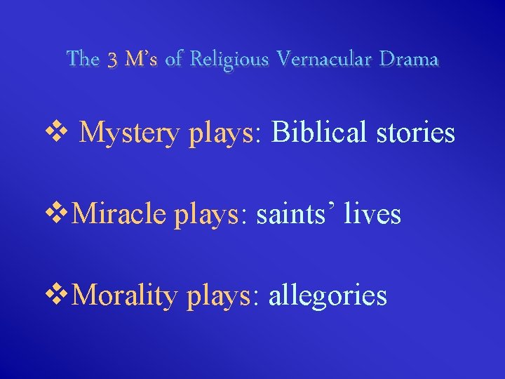 The 3 M’s of Religious Vernacular Drama v Mystery plays: Biblical stories v. Miracle plays: saints’ lives v. Morality plays: allegories