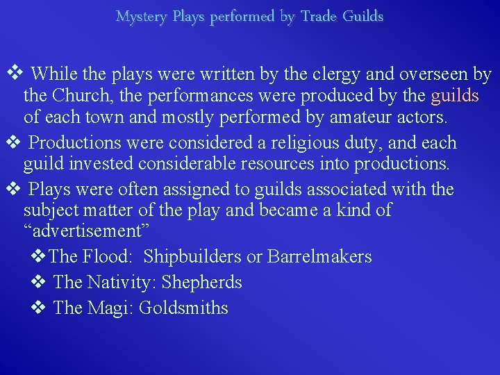 Mystery Plays performed by Trade Guilds v While the plays were written by the clergy and overseen by the Church, the performances were produced by the guilds of each town and mostly performed by amateur actors. v Productions were considered a religious duty, and each guild invested considerable resources into productions. v Plays were often assigned to guilds associated with the subject matter of the play and became a kind of “advertisement” v. The Flood: Shipbuilders or Barrelmakers v The Nativity: Shepherds v The Magi: Goldsmiths