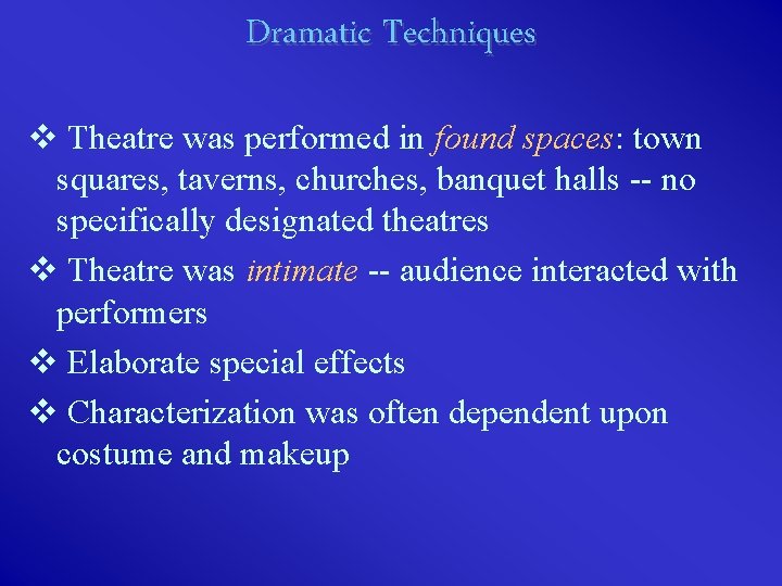Dramatic Techniques v Theatre was performed in found spaces: town squares, taverns, churches, banquet halls -- no specifically designated theatres v Theatre was intimate -- audience interacted with performers v Elaborate special effects v Characterization was often dependent upon costume and makeup