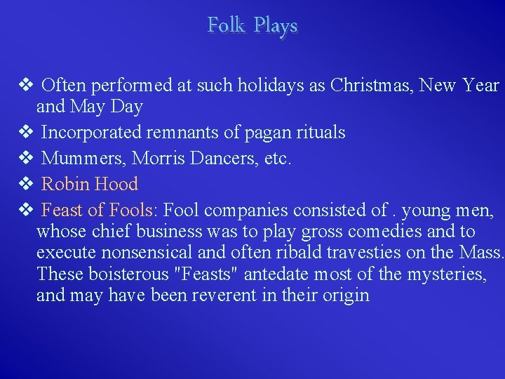 Folk Plays v Often performed at such holidays as Christmas, New Year and May Day v Incorporated remnants of pagan rituals v Mummers, Morris Dancers, etc. v Robin Hood v Feast of Fools: Fool companies consisted of. young men, whose chief business was to play gross comedies and to execute nonsensical and often ribald travesties on the Mass. These boisterous "Feasts" antedate most of the mysteries, and may have been reverent in their origin