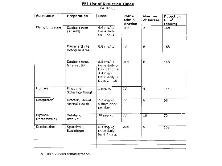 Detekční časy léčiv Ovlivněny: • hmotností koně • způsobem aplikace • velikostí a počtem dávek • tréninkem, výživou • individuálními faktory (metabolismus) • metodikou v laboratoři • riziko „recyklace“ pouze informativní význam!!!
