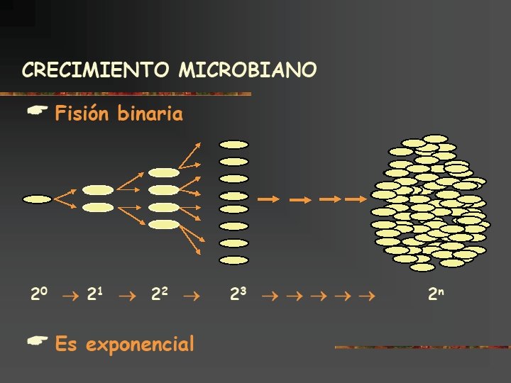 CRECIMIENTO MICROBIANO • Aumento del tamaño (y biomasa) celular • Aumento del n° de células y/o aumento de biomasa de una población celular • Es imposible medirlo en una sola célula • Es limitado, no nos da ninguna Las bacterias se dividen por fisión binaria, y el crecimiento de la población es exponencial