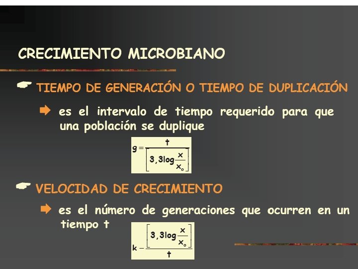 Tiempo de Generación : G Es el tiempo requerido para que una célula se divida o una población se duplique G= t n n = Numero de generaciones trascurridas t = Tiempo Na = Número de células iníciales Nb = Numero de células a tiempo b Nb = 2 n Na lg Nb = n lg 2 + lg Na