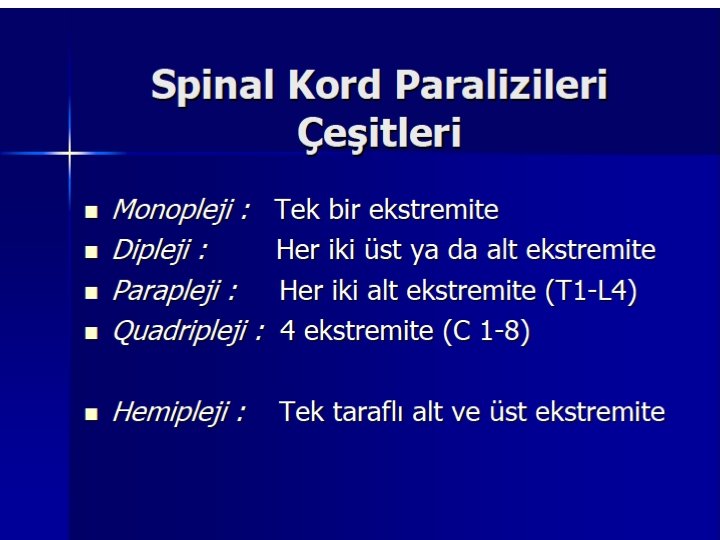 Anatomik lokalizasyona göre SKY’nın tanımlanması n Kuadripleji q q n Torakal 1 üstü lezyonlar. Kolların, gövde, bacak ve pelvik organların fonksiyon bozukluğu Parapleji: q T 1’in altındaki lezyonlar. q Üst ekstremite korunmuş, alt ekstremitede fonksiyon bozuk.