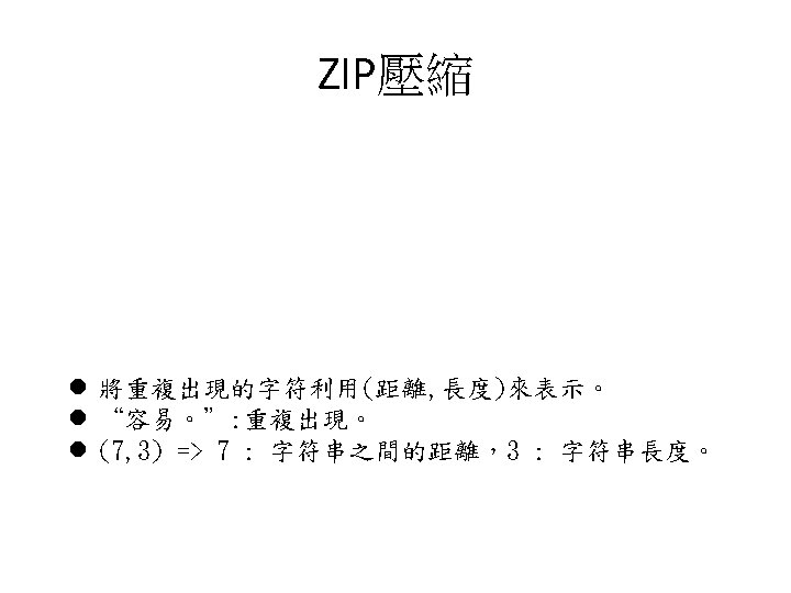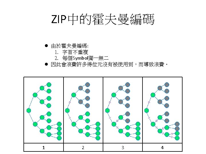 霍夫曼編碼(Huffman encode) 1. 字首不重複 2. 每個Symbol獨一無二 Example: 001001001111 Symbol Stage Il Stage ll. I Stage IV 00 0. 4 0. 6 0 10 0. 2 0. 4 0 0. 4 1 11 0. 2 0 0. 2 1 010 0. 1 0 0. 2 1 011 0. 1 1