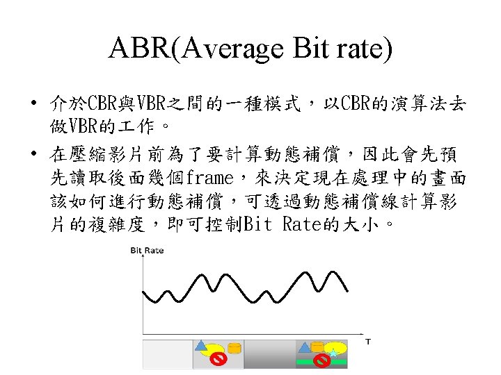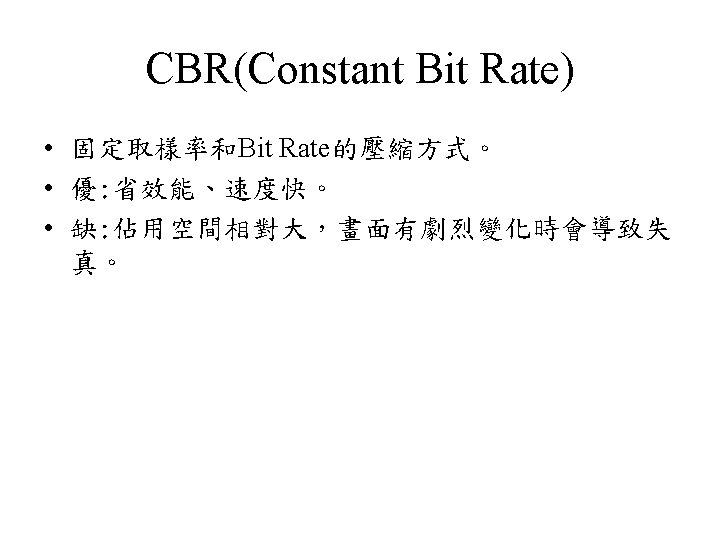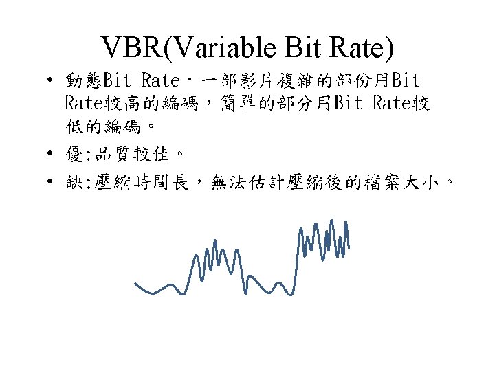 多媒體Data Rate • CBR(Constant Bit Rate) • VBR(Variable Bit Rate) • ABR(Average Bit Rate)