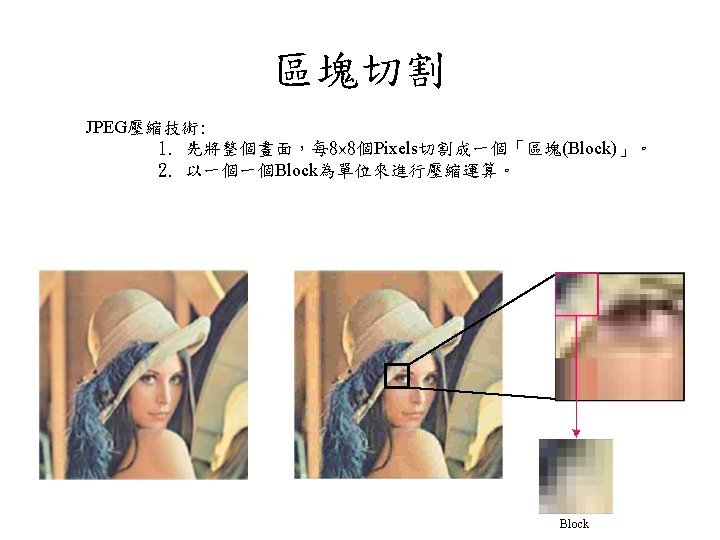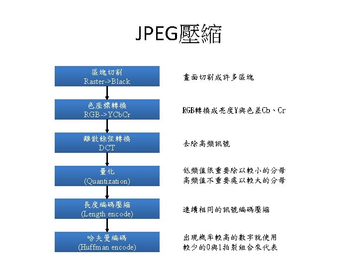 色座標轉換 人類眼睛對亮度非常敏感,但對顏色較不敏感,透過矩陣轉換將RGB轉換成 YCb. Cr訊號再進行壓縮。 R= G= B= 105 106 112 126 149 178 203 219 61 62 67 84 108 137 163 179 99 106 119 139 168 189 209 222 54 61 76 97 121 149 169 182 95 109 133 161 187 207 221 228 49 66 90 119 147 166 179 186 55 77 110 144 171 185 191 76 97 132 166 190 199 198 195 100 120 151 185 211 226 232 233 119 140 173 207 231 243 240 Y= 148 166 194 222 248 244 107 124 154 182 200 206 204 199 177 190 212 232 248 252 253 250 137 150 171 191 204 207 205 202 197 205 222 236 248 251 253 251 158 165 181 194 203 206 205 204 46 47 53 67 90 119 146 162 12 43 23 56 98 76 75 40 47 60 80 104 130 152 165 44 56 123 46 88 67 67 45 36 50 74 102 128 148 160 167 41 61 92 126 152 167 171 172 60 81 114 148 170 180 178 175 54 57 146 154 32 143 145 234 185 Cb= 15 52 134 45 36 50 74 102 119 147 166 179 66 90 119 147 47 60 89 107 135 136 181 187 183 179 40 120 133 151 171 183 187 183 180 83 101 123 157 163 189 203 222 140 148 161 175 183 186 183 181 30 44 68 96 231 243 240 40 41 47 61 84 113 139 155 51 54 47 60 34 41 54 74 95 124 145 158 45 87 134 45 30 44 68 96 122 142 155 162 33 96 122 142 155 162 187 199 35 55 86 120 146 161 166 167 54 75 108 142 165 174 171 83 101 129 157 176 182 179 175 Cr = 80 166 190 199 198 80 104 130 196 66 90 119 147 124 54 133 108 142 165 177 135 176 182 179 175 144 153 222 131 167 187 198 211 214 219 113 126 146 166 179 183 181 178 43 182 200 206 204 199 122 133 141 156 170 179 182 181 179 112 145 176 161 187 207 221 228 Y代表亮度訊號 Cb、Cr代表色差訊號 Cb : 藍色與綠色的差異 Cr : 紅色與綠色的差異