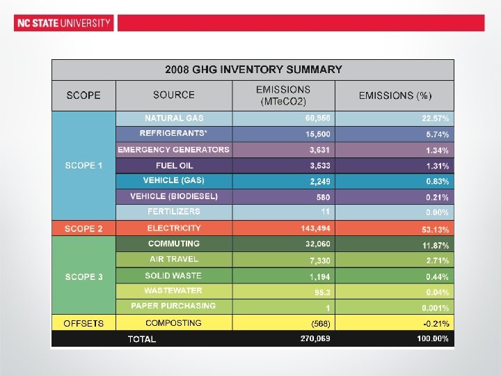 NC STATE GHG EMISSIONS INVENTORY • WHO: Jeff Hightower- Director of Utilities Infrastructure for Facilities Operations and student interns • WHEN: Time Frame- Data from both 2008 calendar year and 2007/2008 Fiscal Year • WHERE: Boundaries- Main Campus, Centennial Biomedical Campus and some satellite offices • HOW: Calculators- Clean Air, Cool Planet; Climate Registry; EPA; Atmosfair