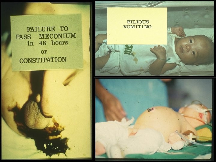 CLINICAL FEATURES Delayed passage of meconium(95%) n Abdominal distension n Bilious vomiting n Severe diarrhoea altrenating with constipation(10 -15%) Enterocolitis of hirchsprung’s disease n