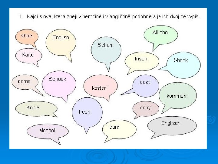 Gemeinsamer Wortschatz l l l Wörter aus dem Alltag (z. B. Farben, Tiere, Pflanzen, Wetter, Familie, Schule, Wochentage, der menschliche Körper etc. ) Wörter aus dem Griechischen bzw. dem Lateinischen (z. B. Monatsnamen, Schulfächer, Wörter wie Organisation, Meter, Modell, Musik etc. ) Anglizismen (PC, Internet, Party, Interview, Jeans atd. )