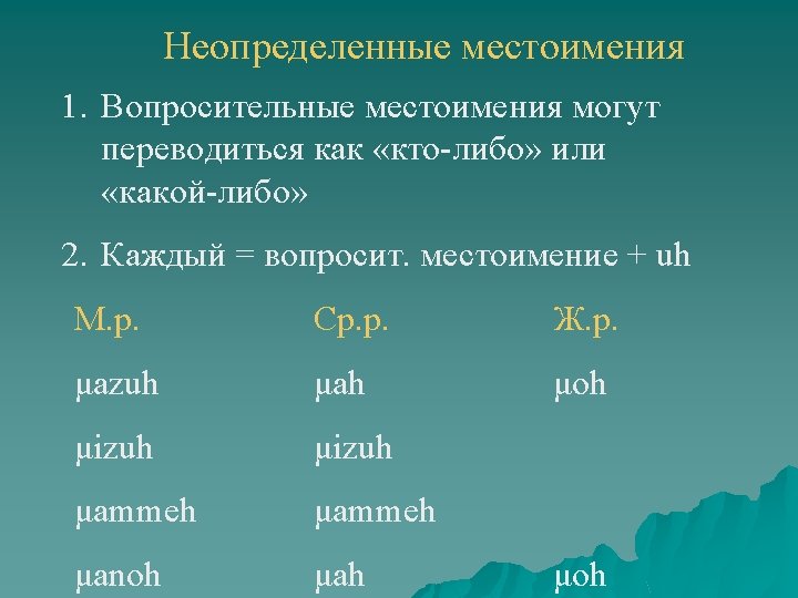 Неопределенные местоимения ni mannahun, ni μashun, ni ainshun - никто М. р. Ср. р. Ж. р. ainshun ainohun ainishun --- ainummehun ainaihun ainohun
