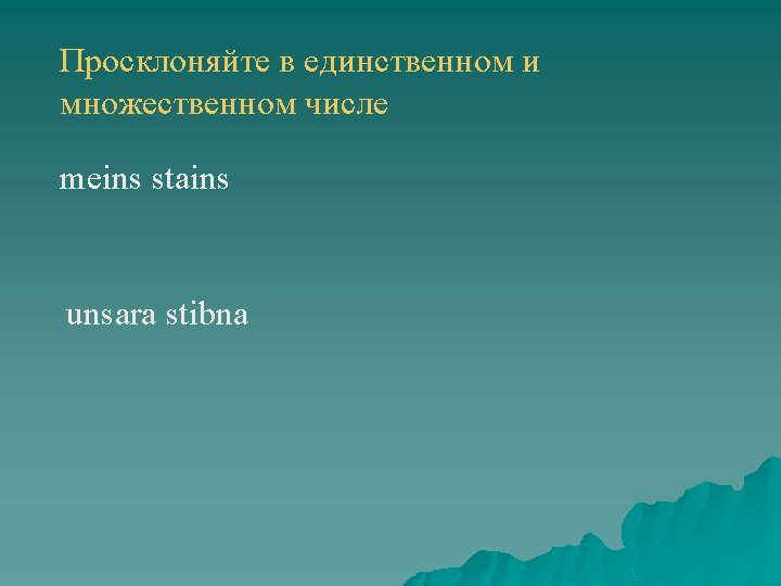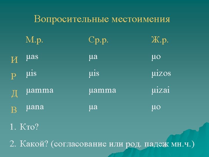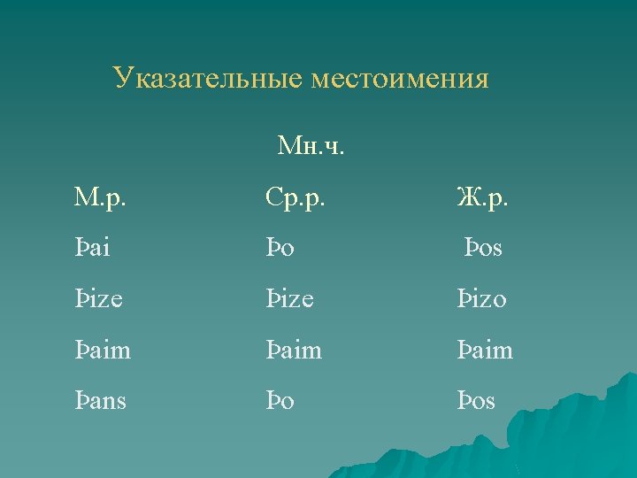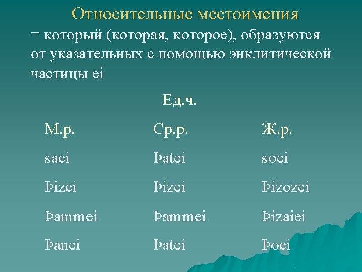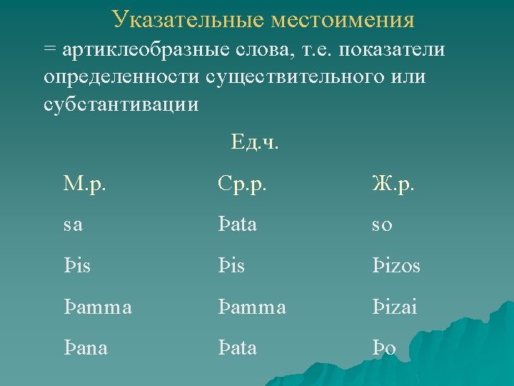 Притяжательные местоимения meins Þeins unsar izwar seins Множественное Единственное число И Д Д ВВ м. р. izwaraize izwaris izwaraim izwaramma izwarans izwarana ср. р. izwaraize izwaris izwaraim izwaramma izwar ж. р. И izwaros izwara Р izwaraizos izwaraim izwarai izwaros izwara
