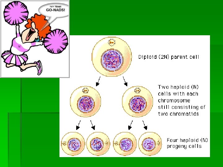 The “Haploid” Condition § Meiosis results in the production of haploid gametes (sex cells) which have only 23 chromosomes. § The diploid cell that entered meiosis has become 4 haploid cells (N).