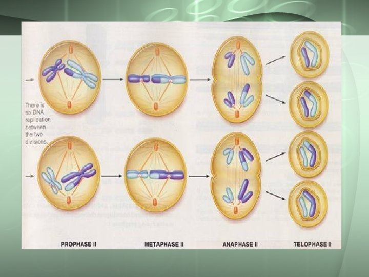 Meiosis I • Interphase I: copy chromosomes • Prophase I: pair homologous chromosome, form a tetrad • Metaphase I: spindle fibers attach to chromosome. • Anaphase I: fibers pull homologous chromosomes toward opposite ends. • Telophase I & Cytokinesis: nuclear membranes form. Cell separates into 2 cells.