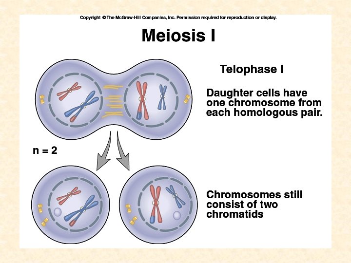 Telophase I—Similar to telophase in mitosis. Cytokinesis Interphase II • Now have 2 haploid cells with mitotic chromosomes. • Very brief. No DNA replication
